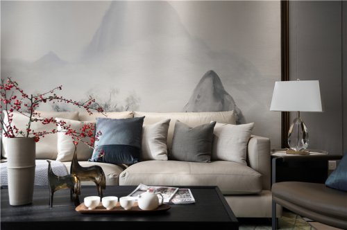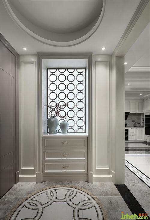 玄关米白色与暖灰色护墙板相互搭配,干净利落,内敛克制,地面也选择同色系,将素雅感进行到底。玫瑰金雕刻屏风,与群青色将军罐,寥寥数笔将浪漫东方雅韵,绘制在同一张画纸。