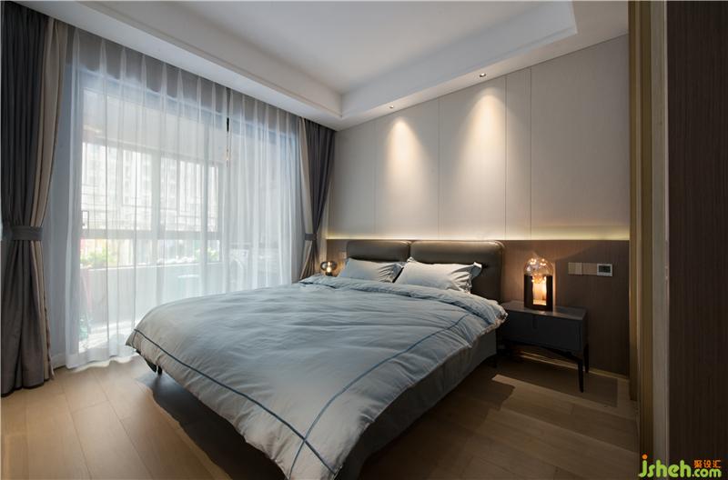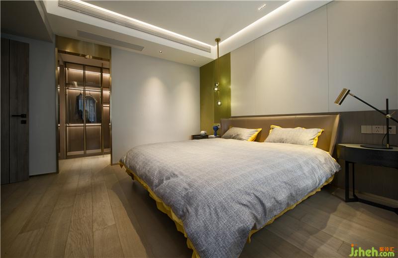主卧室一般都具有一定的私密性、避光性,配套洗浴,静谧舒适,与其他空间明显的分割,是整套房子最私人的空间,完全根据业主的要求去设计。设计卧室时首先考虑的是让人感到舒适和安静。空间宽敞,1.8的双人床,同时配套有衣帽间,步入衣帽间进入卫生间。卧室设计的核心是床和衣柜,其他的家具和摆设根据需要来添加。床头墙面用硬包与造型墙板拼块,简洁,柔软,有立体感。家具以及灯光的颜色是暖色调的。整个空间的和谐能让人消除一天的疲劳,在柔和的环境坦然入睡。
