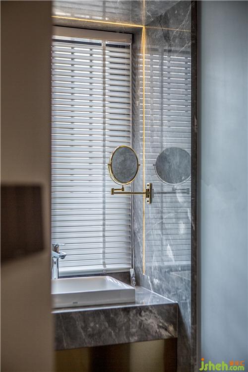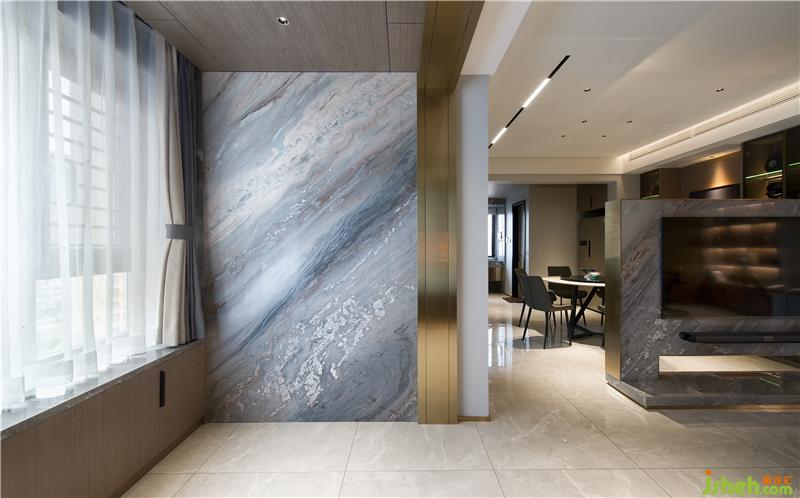 客厅是生活的中心,是一个万能空间。它是一个公共空间,与私人空间是完全分开的。在设计时要考虑到业主的家庭成员、身份地位和他的社会关系。通过对家具的陈设来逐渐一个稳定的空间,以满足家庭对其空间的需要。地面使用灰色地砖托起一个舒适氛围,天花采用平顶和线条进行分割,墙面及沙发背景运用到了艺术涂料和墙板相结合同时加上明暗色彩与造型的碰撞,打造出不一样的视觉感。电视背景采用蓝金沙大理石与金属的结合彰显奢华。