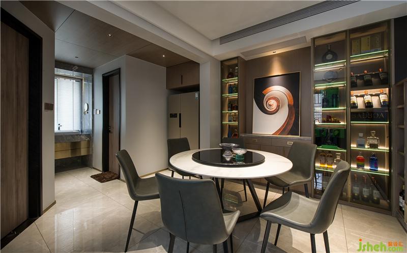 餐厅是家庭成员享用用美食的地方,同时也可用来开家庭会议。整个空间利用艺术涂料和灰色玻酒柜,以装饰花瓶衬托,再加上极简岩板现代餐桌组合,显得空间十分完美和谐,更能增加主人翁的食欲。