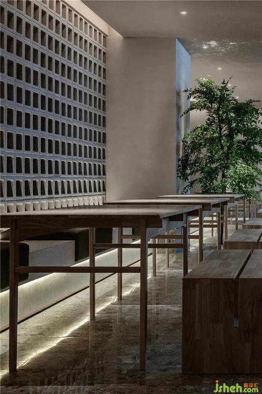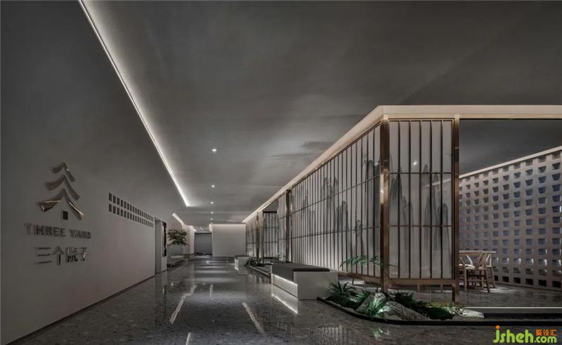 餐厅与茶室隔断区域的镂空空心砖阵列开来,通过每个孔洞的穿透将茶室区域的水墨山水栩栩如生的写照在餐厅的每个空间缝隙中,即强调了细节的品质,也体现了Three Yard的文化特征,带给人大气磅礴的观感又不失思绪的延展福州养生馆设计。