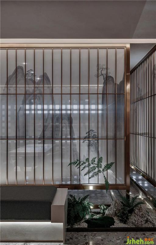 随之扑面而来的是设计中以当代手法将山水、自然和光影结于一庭,整个空间由一幅美轮美奂的长廊绢纱定制的水墨山水画卷串联起来,经典的符号、现代的工艺、清隽简洁的艺术与文人雅士的生活场景交叠融合,寥寥数笔,东方的清雅与灵逸缓缓而入。