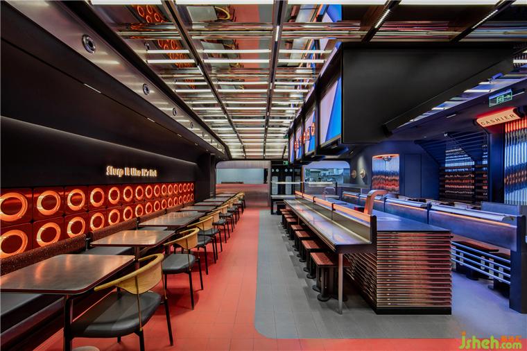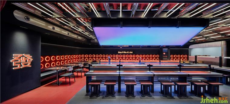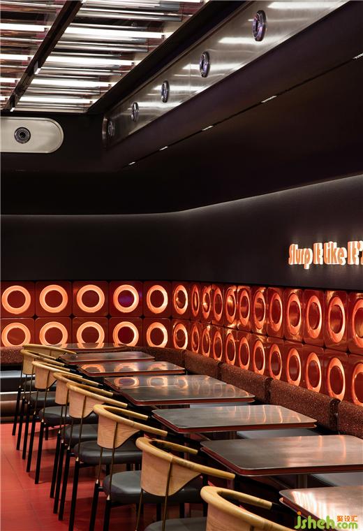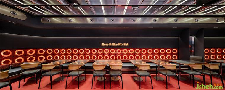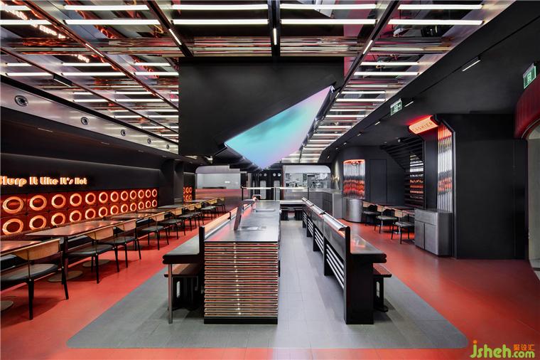 红色从门头蔓延至室内墙面和地面,成为空间的主基调。杭州餐厅设计在沉稳质感的黑色映衬下,自内而外散发出潮流、动感的活力。一场感官激荡下的嗦粉社交即将启程。