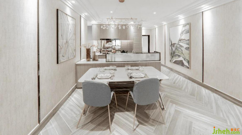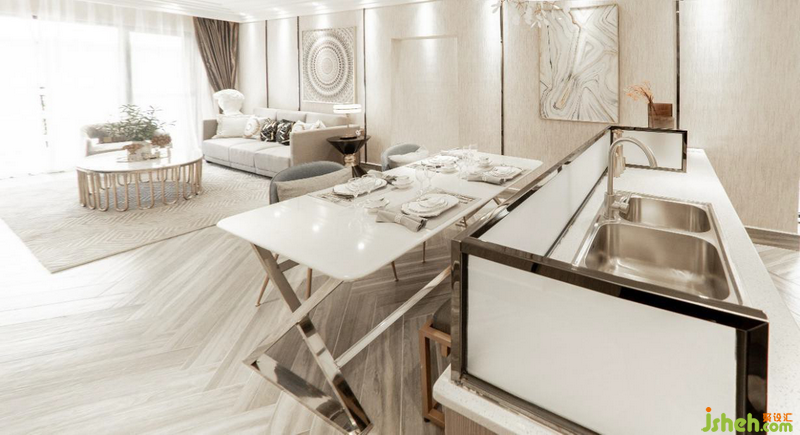 与以往独立式厨房设计相比,开放式厨房不仅是在为住户创造宽敞舒适的环境,也是在增加家人之间的互动交流,让心与心、人与人彼此贴近,而且,设计师有利用柔和、轻缓色调的材质进行调和,塑造出住户内心向往的生活状态。