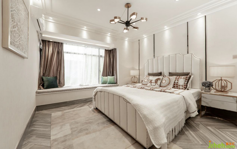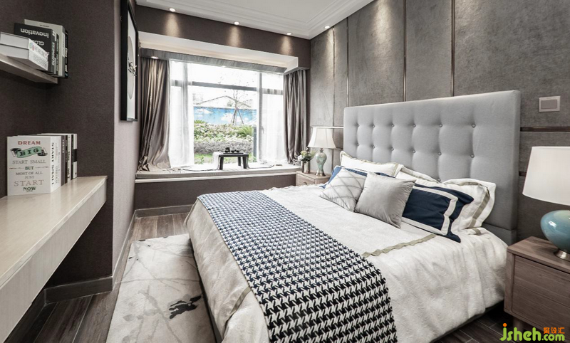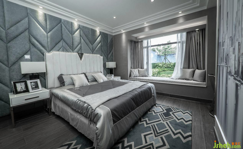 墨绿色几何背景墙软包与地毯,有种错位却能衔接的不规则美,静雅高贵的守护者主卧的宁静,闲暇时,坐在床边欣赏窗外四季光景,落英又缤纷,生活之美,不过如此。