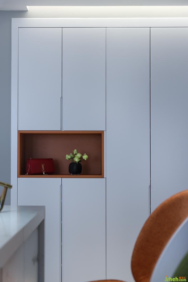 入户玄关是连接室内外空间的渠道,是来客对这个家的第一印象。室内设计师在满足其美观度的同时,也要考虑实用功能,因此做了到顶的整面鞋柜,暗拉手的设计也保证了空间的整洁。