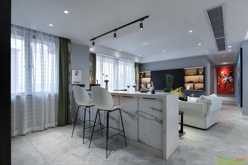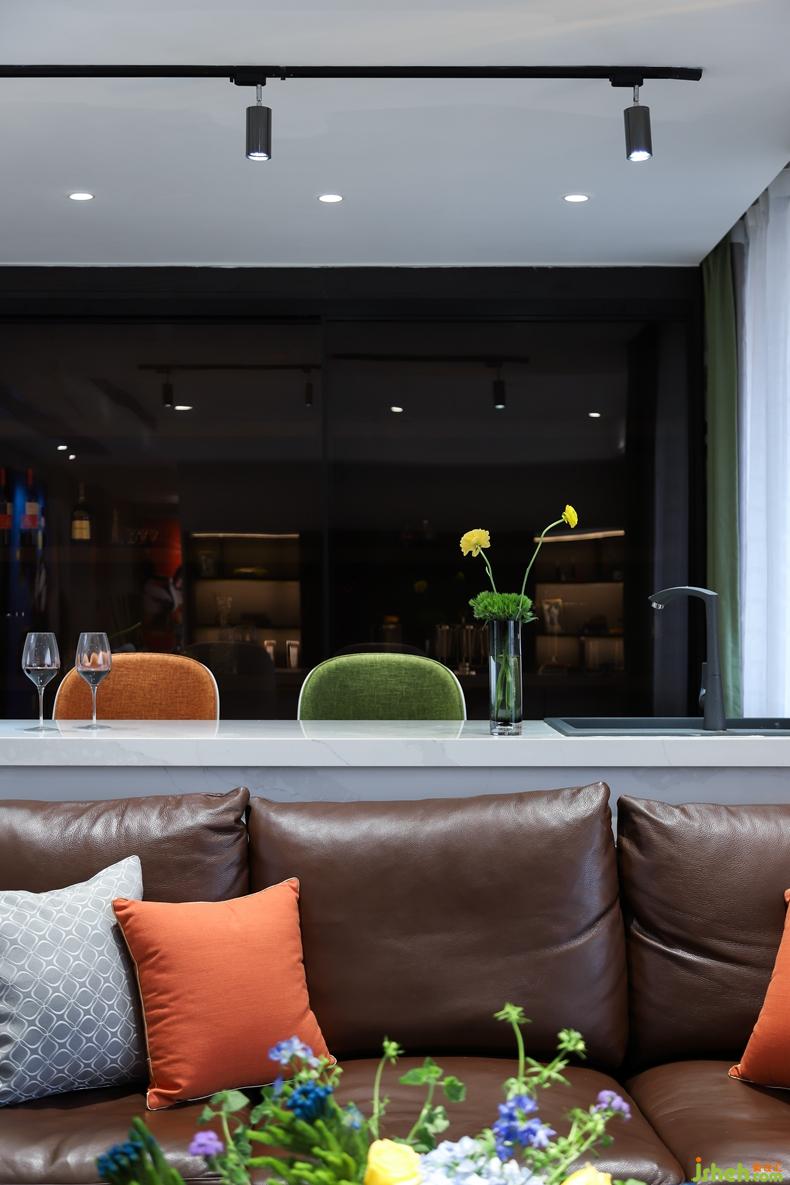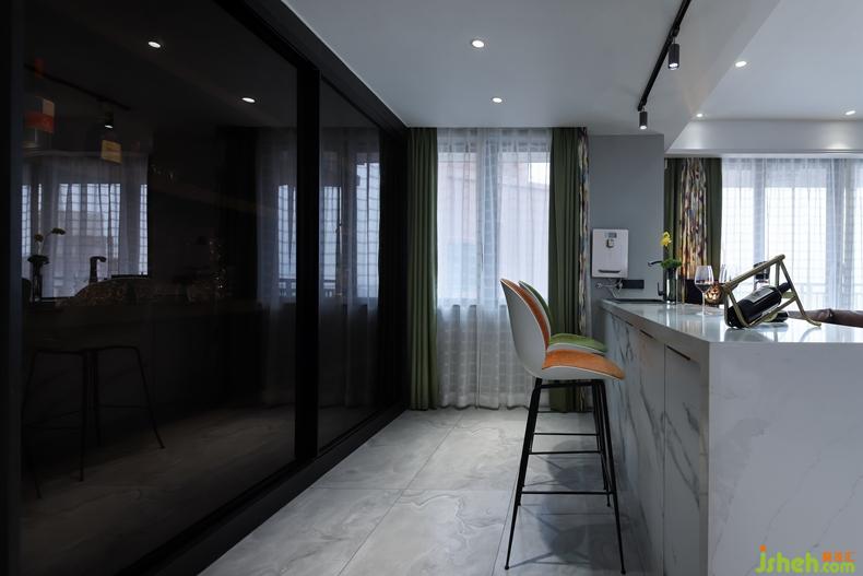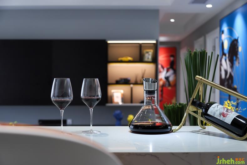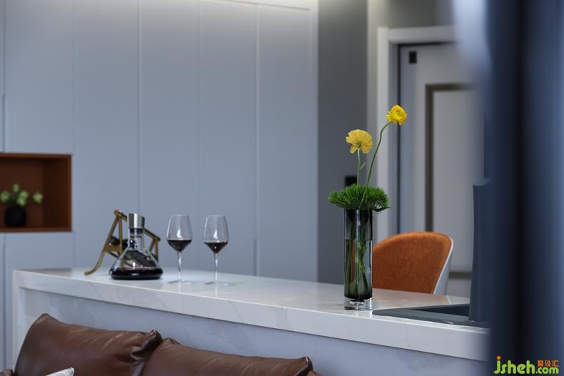 休闲区采用整面背景玻璃推拉柜门酒柜,大气不失格调,吧台台面采用白色岩板,忙碌的工作之余,小酌一杯