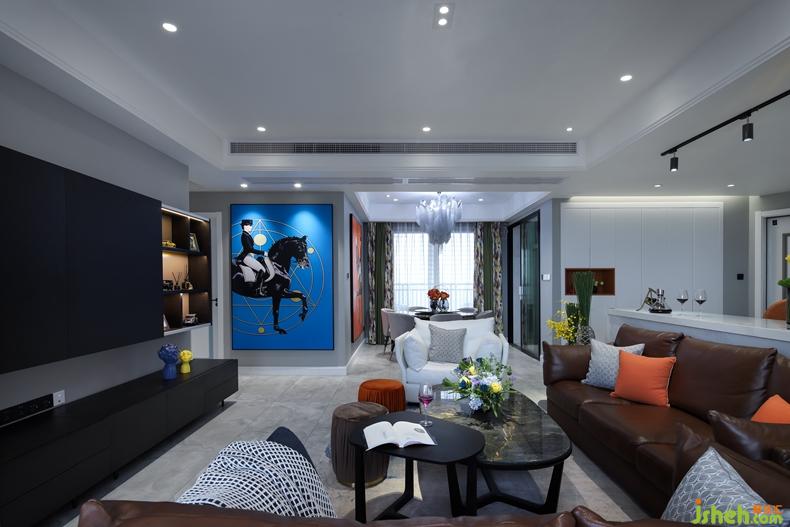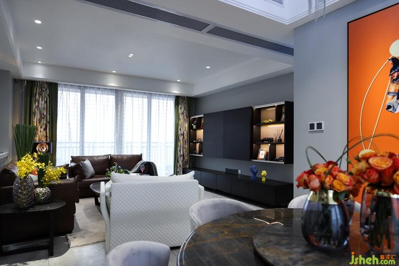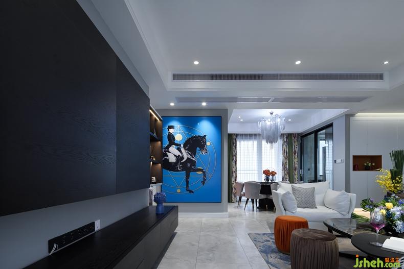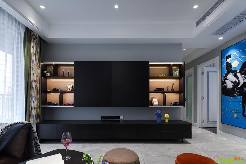 客厅硬装简单;室内设计师天花做无主灯设计。分布在空间各角落的小光源,共同渲染出一个柔和、明亮的空间。黑白灰为主色调的空间,搭配多彩的饰品,提高空间颜值。