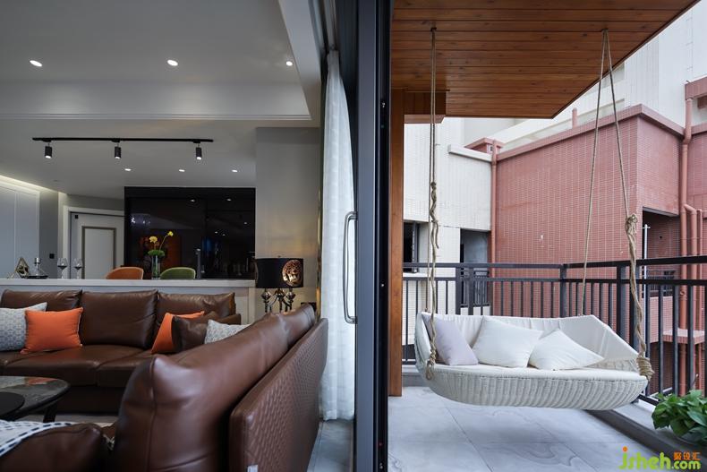 休闲阳台天花及墙面采用防腐木装饰,营造优美的室内花园,搭配双人摇椅。家,是用来释放一天的压力,舒心的地方。
