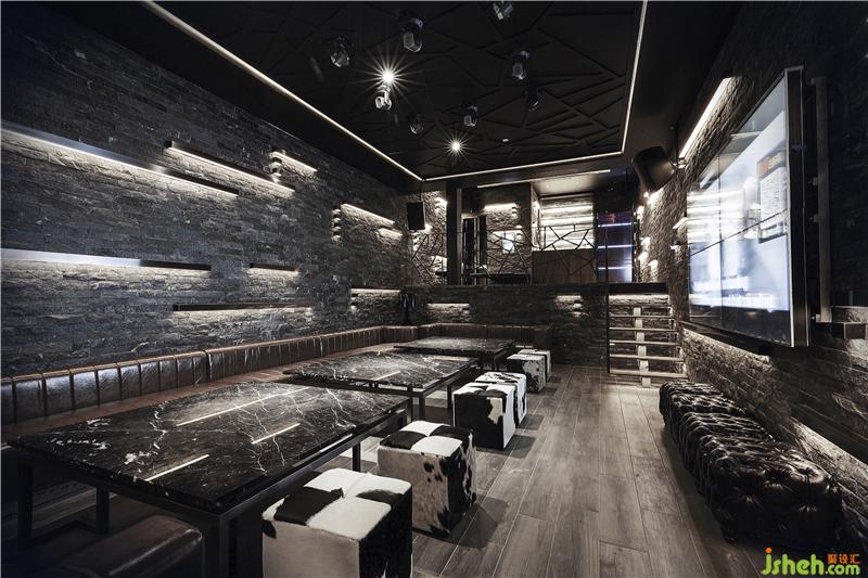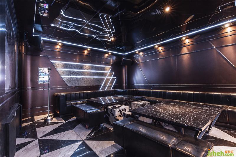 设计风格的主调偏夜店风,设计师从“9plus”Logo原型中获得创意启发,衍生出墙面、地拼、天花吊顶皆选用折线、硬朗元素。