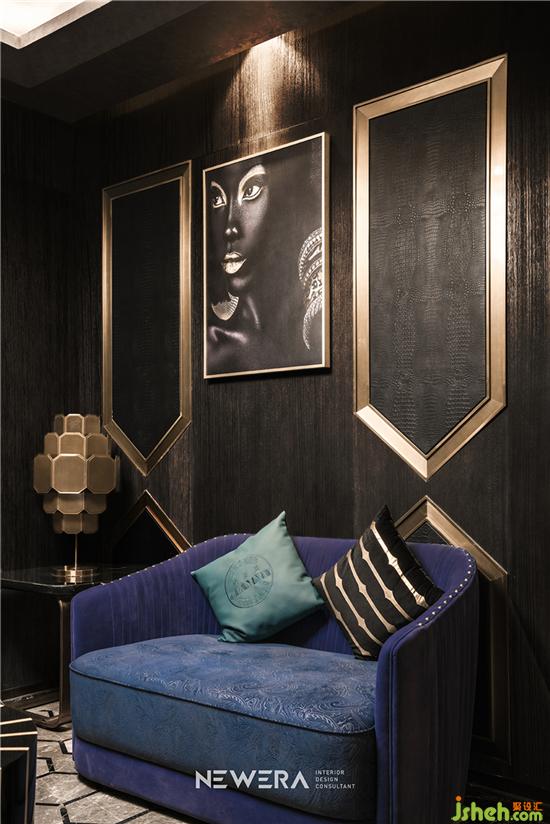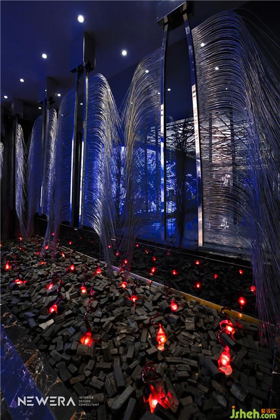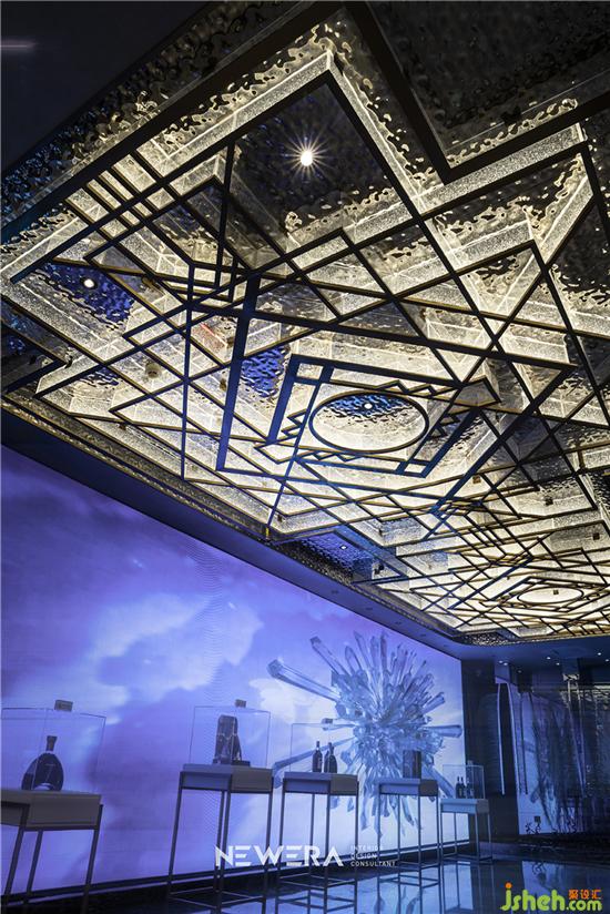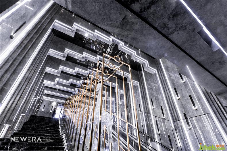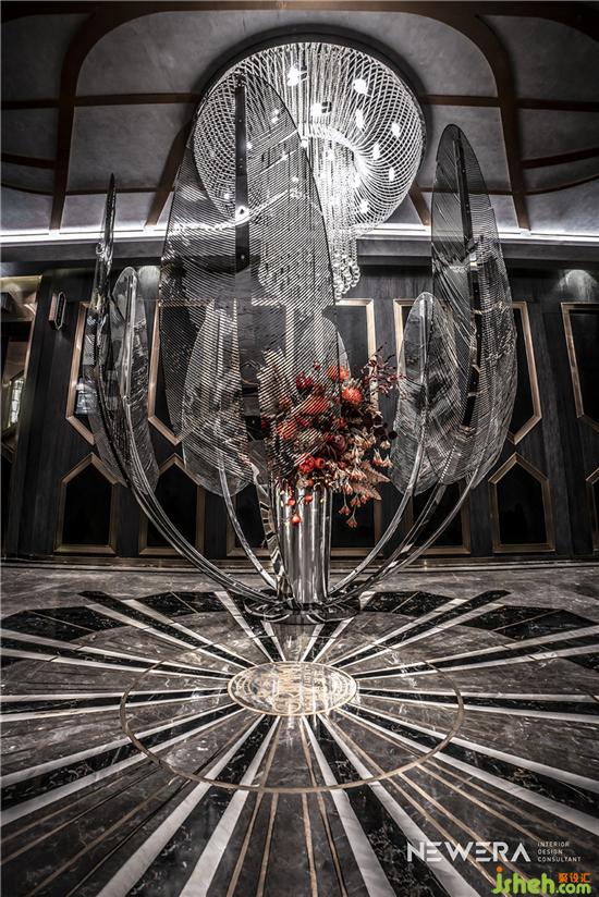 黑金色的空间色调,从建筑外延伸至大厅,凸显空间整体的神秘与艺术感。大厅中央大型水晶装置,搭配机械金属羽毛艺术装置,强烈的线条装饰性,酒吧设计使空间的造型充满诗意和富于装饰性。放射性的地面造型,基调以灰色调天然石材夹揉金属不锈钢材质,以对称结构强调了仪式感.酒吧设计