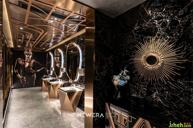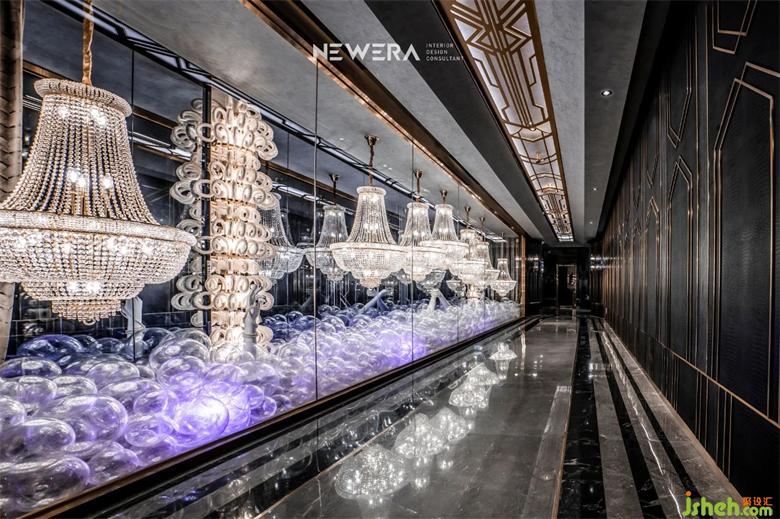 基于对用户的深入研究,新冶组设计出贴合用户习惯的沉浸式打卡拍照区域,派对空间设计并从大厅的网红打卡区到公共过道的艺术装置进行沉浸式布景。这一思路延展贯穿至接待区、威士忌水吧、雪茄吧、VIP包房区、BOSS包房区,以及BOSS包房区专属电梯,形成了完整、绝对性的氛围一致性,实现了视觉与心理、情绪上的充分浸染。KTV设计师这种创造方式就是赋予形体“意味”的过程,也是将设计观念注入设计的过程。
