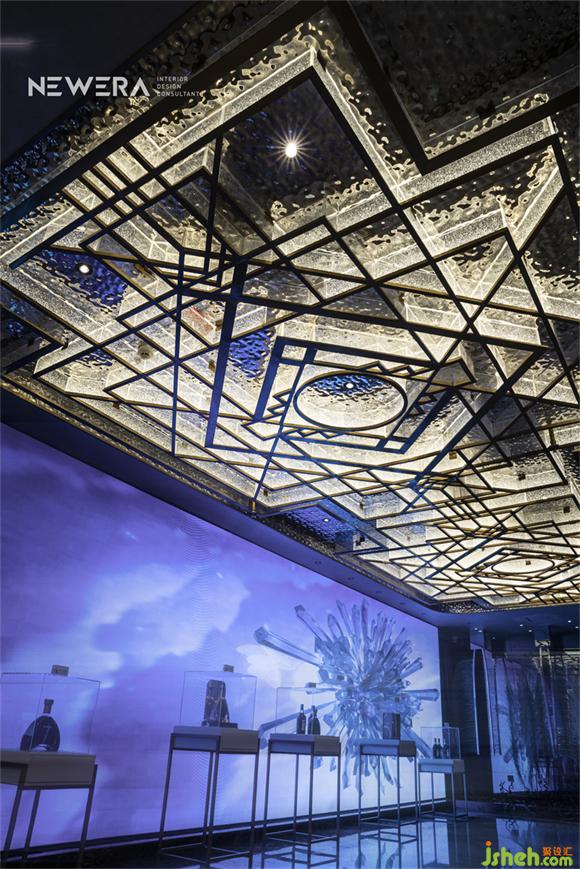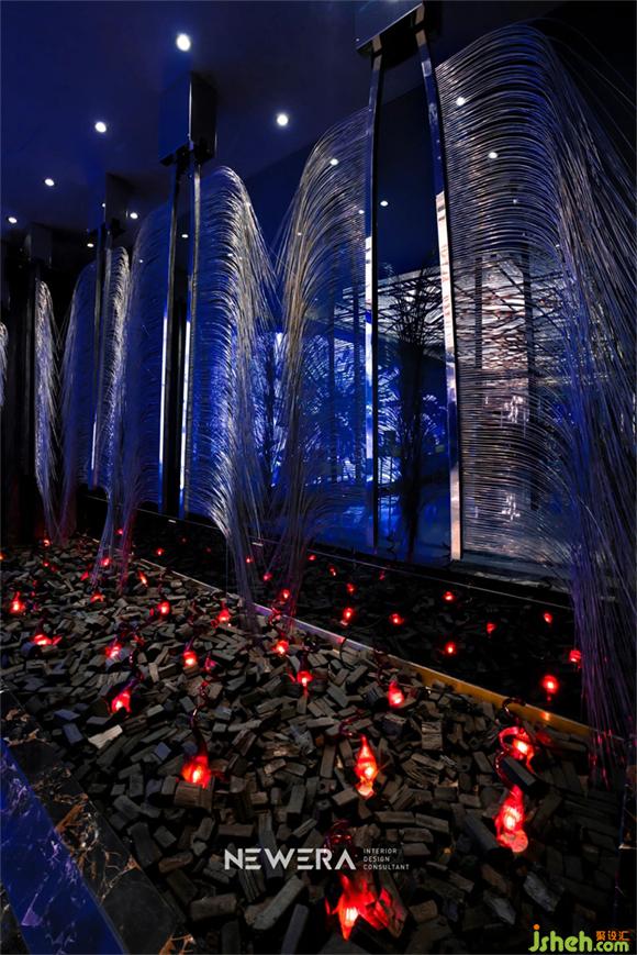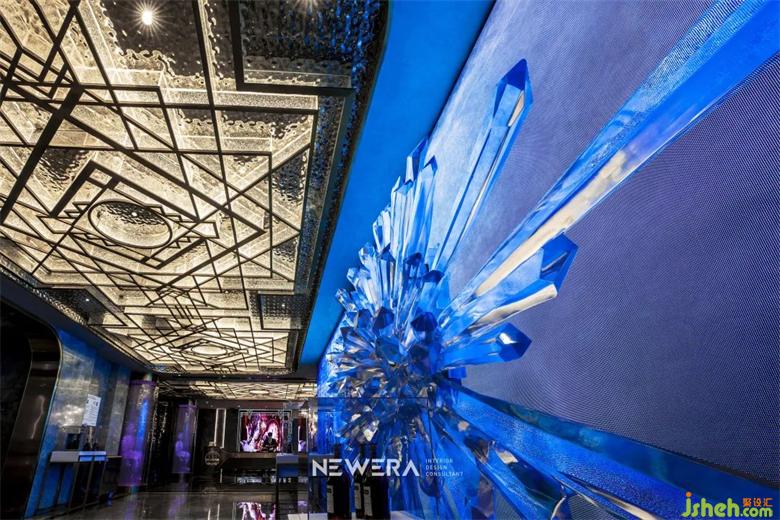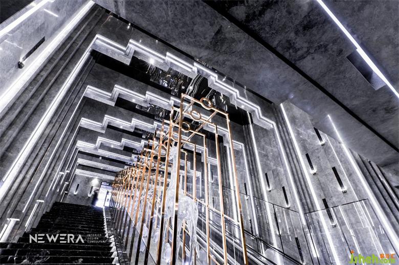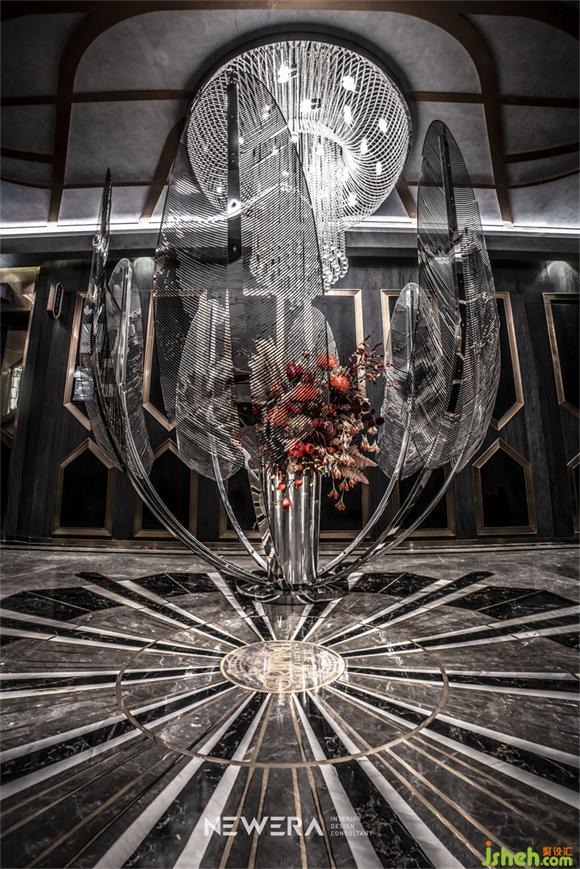 黑金色的空间色调,从建筑外延伸至大厅,派对空间设计凸显空间整体的神秘与艺术感。大厅中央大型水晶装置,搭配机械金属羽毛艺术装置,强烈的线条装饰性,使空间的造型充满诗意和富于装饰性。放射性的地面造型,基调以灰色调天然石材夹揉金属不锈钢材质,KTV设计师以对称结构强调了仪式感。