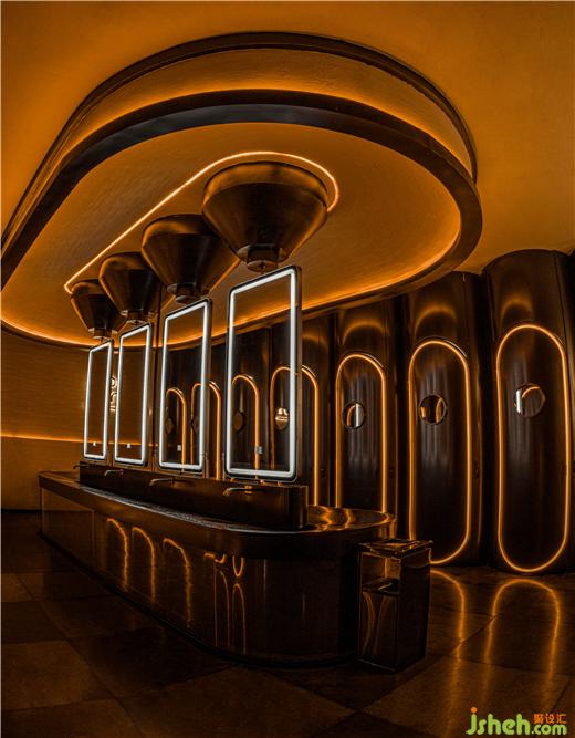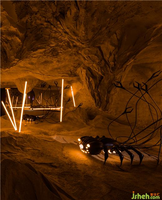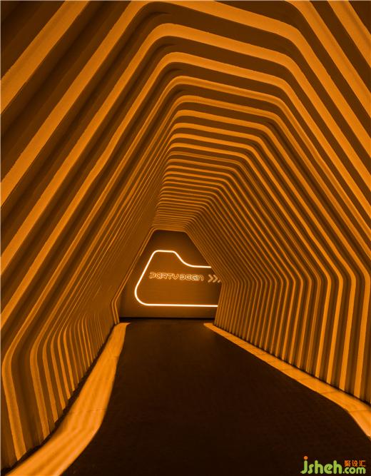 末日摧毁了现有的文明与秩序,却又留存着文明残影,这种近乎野蛮原始但又文明秩序的交织,酒吧设计连通了人类的过去与现在。甫一出场的沉浸式过道曲折迂回,艺术灯阵手法遁入时空隧道错觉,凝聚万众期待与好奇,由此叩开后启示录大门。化妆潮玩区夯土粗粝纹理传达环保设计理念,序列镜面引导视觉秩序与知觉延续。抽象未来主义的异形雕塑致敬经典科幻IP,在多媒体快闪形态下将越夜越野的情绪无限渲染。