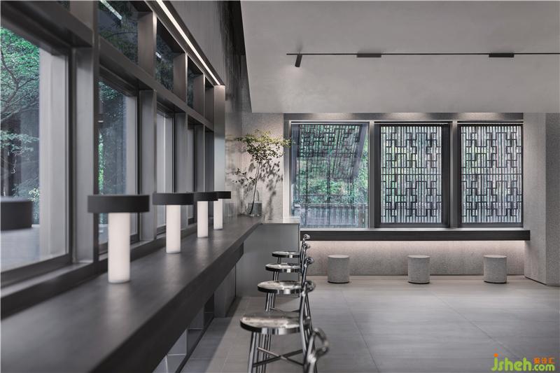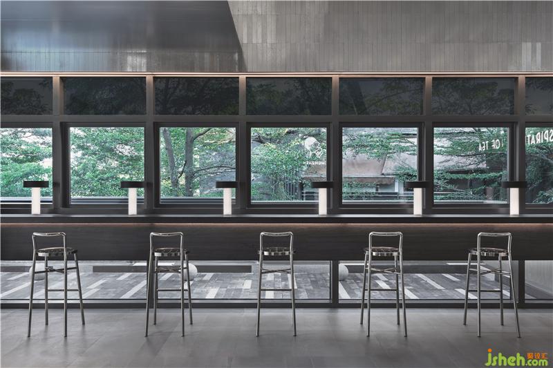 设计采用天花照明手法,以金属格栅后置发光膜的间接式照明,点缀以实验室导管形制的灯饰,凸显简洁干净的空间质感。两侧墙面运用的泡沫金属铝板材质,与精致的缎纹拉丝金属形成材质碰撞与对比。临窗而坐,沿着可翻折式木艺窗棂望去,葱茏见绿,清新舒怡。喜茶设计