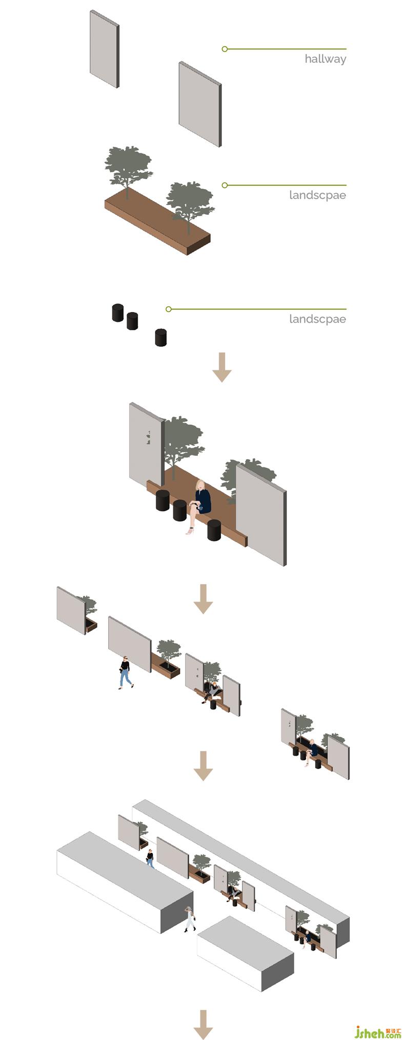 设计师希望在此模糊空间场所的属性,依托空间所产生的交互的,空间即是产生未知的场所,当空间具备情绪,人会有更高级的体验。设计师借鉴园林造景的手法,在室内营造小处景观,消弭公共空间的视觉和心理边界,让室内外的美好并存,在艺术感知、思维沉浸、灵感绽放的过程中,激发使用者与空间的无限互动