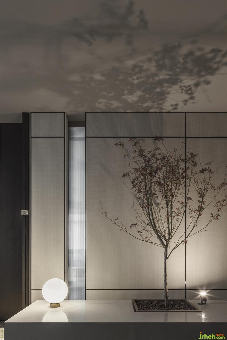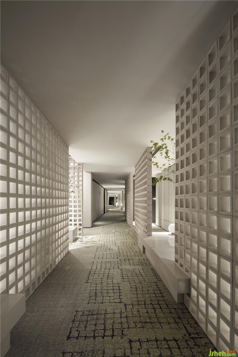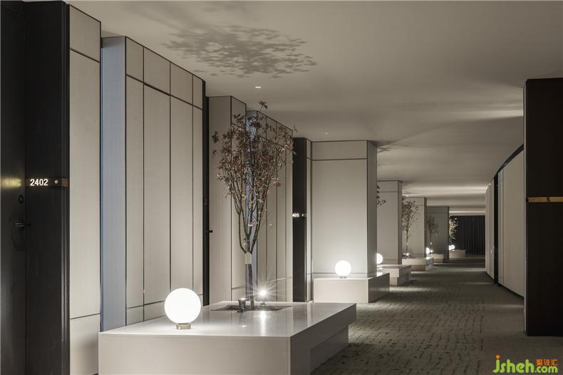 客房过道区域,设计师大胆地提出客房内退的形式,牺牲客房的空间,以迂回式的入门仪式,通过门口的景观、屏风,不同组合方式围合出独立小庭院,与外界隔绝,构成廊道街区效果,制造美好的体验感与私密性
