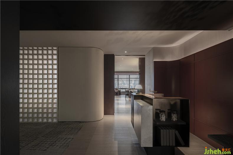 设计师将连接贯穿两侧过厅的廊道,扩展为标准公区的外延,在此开辟出供住户们品尝茶点、酒店设计阅读放松之用的餐厅,升级酒店顾客体验。廊道两侧入口的玻璃屏风,增强私密性与仪式感;天花的构造运用古典建筑手法,以弧度元素与高级质感为整个空间定下“建筑艺术”的基调