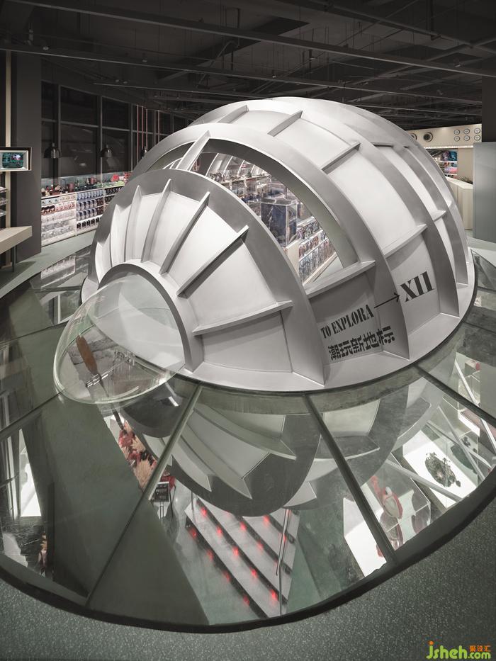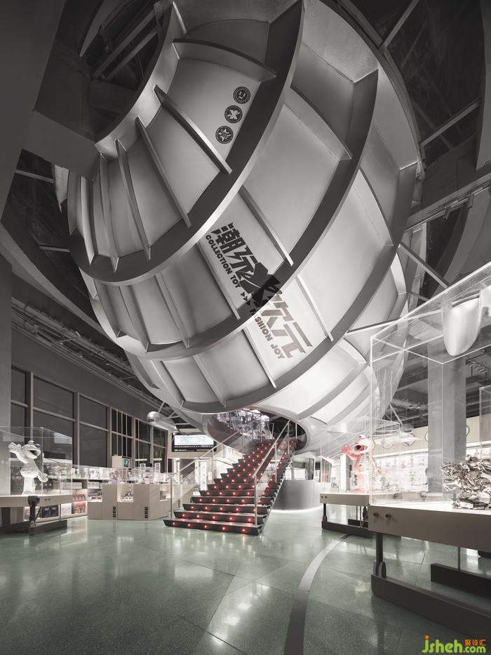 東木巧妙利用了原有空间,打开界面,潮玩设计将全金属打造的飞艇与链接上下楼层的交通功能相融,置入空间中央。巧妙地营造复古与未来对话的科幻场景,同时提高了空间的利用率。