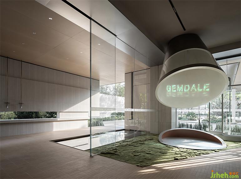 The "garden" foyer is a subtle integration of simple textures and natural ambience. Transparent glass along with rhythmic light and shadows produce an atmosphere that blurs spatial boundaries. Earth-texture finishes, mottled handmade terra-cotta bricks, property models area presented in the form of landscape adornments, and the carpet that simulates a grassland, create an immersive garden touring experience.