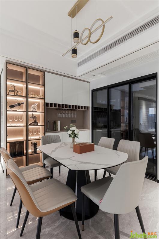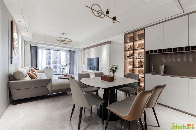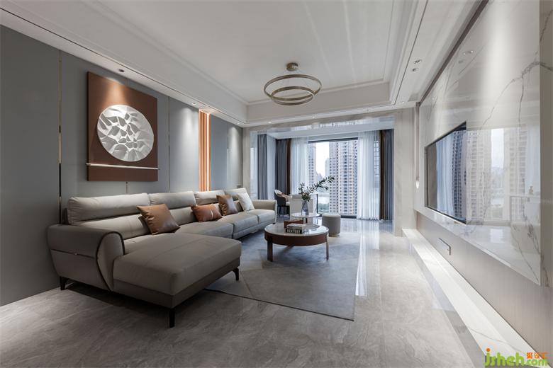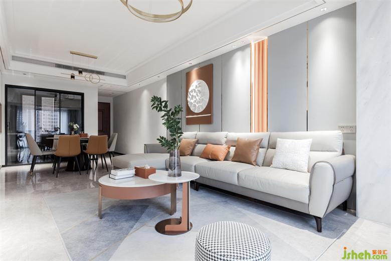 沙发背景墙采用大片浅灰色皮革硬包设计,家居装修搭配以局部爱玛仕橙的背景和灯光结合让空间艺术感提升,浅咖色的皮面沙发散发温暖静待入座,整个空间自然简单,有趣纯粹,线条吊灯恰到好处地点缀其中,细述了场域的情感交集。