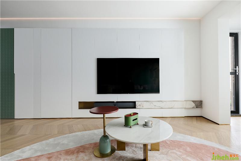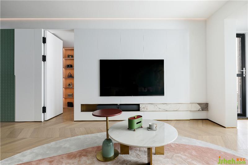 家庭的居住空间,就应该契合居住者的生活理念,满足居住者的生活需求,而定制化设计,刻画一个人与空间的共存关系。客厅电视背景墙隐藏衣帽间,扩大储物面积,空间更显简洁清爽。