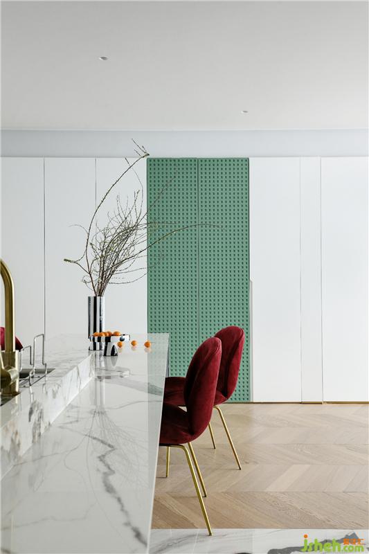 房子的日常是主人生活方式的呈现,是一个家庭生活态度和审美取向的展示。在餐厅、厨房的设计上,我们取之自然,用之自然,也爱之自然,用绿色点缀空间,加入植物的嵌入,整体空间给予人安宁的体验感,让居者回到本性中的宁静清澈。