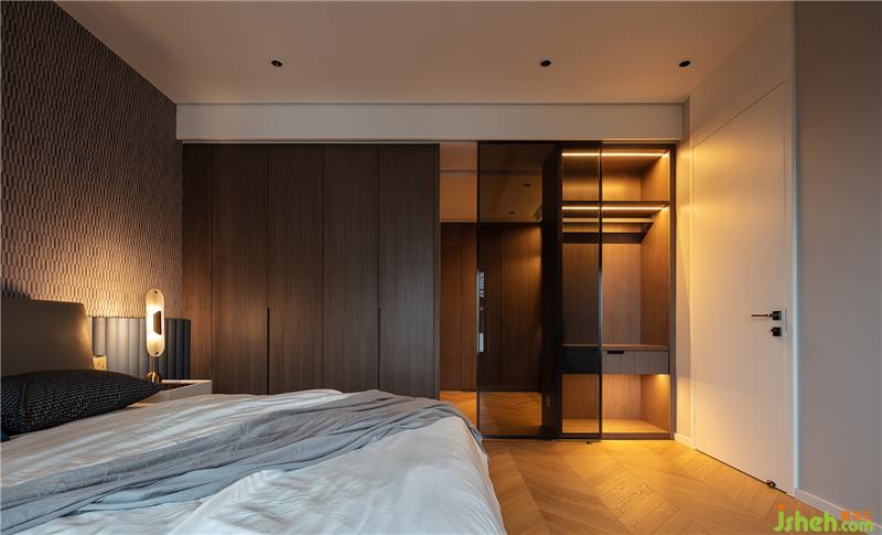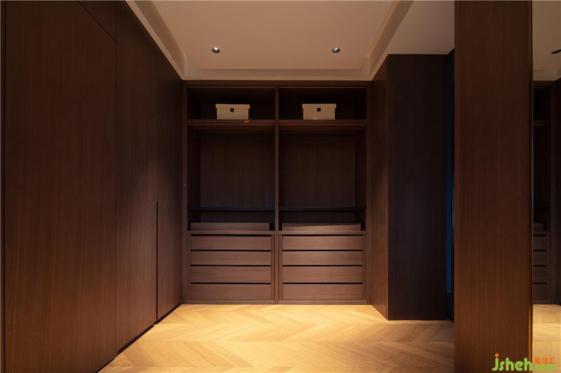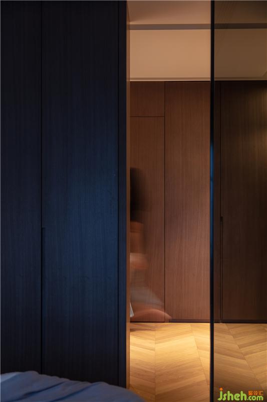 推门而入,顿至婉转。主卧空间内藏的更衣室,延续主卧典雅浅淡的基调,摒弃了繁冗复杂的装饰,删繁去简,原木的质感,宛如引自然之气入室,木纹的气息是时间的记忆,蕴含了大道至简的美学之道。