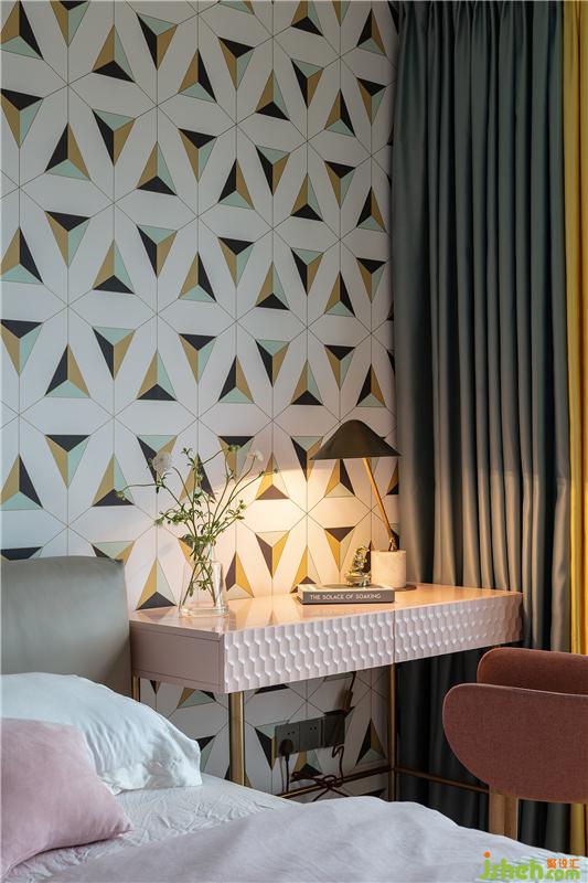 女孩房格调清新,龙岩别墅设计别具一格的背景墙成为了空间的视觉焦点,点、线、面、块四大视觉要素作为室内空间的亮眼之处,大小、疏密形成丰富的变化序列, 突出空间的虚实感。结合羽毛样式抱枕和粉色书桌,使得活泼与甜美融入场景中,精致的灯艺和亭亭玉立的绿植,细微末节中是对孩子更温柔绵长的爱的表达。