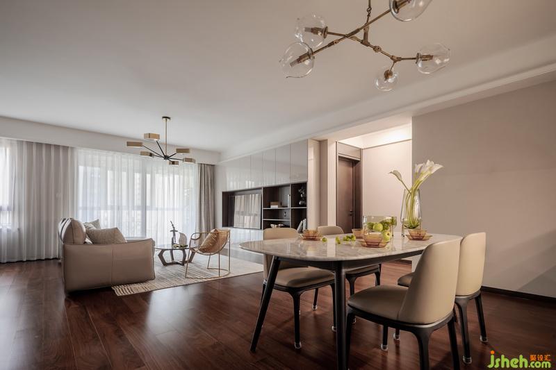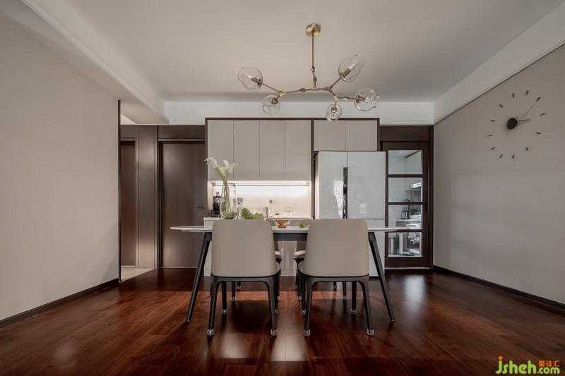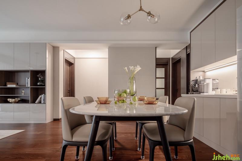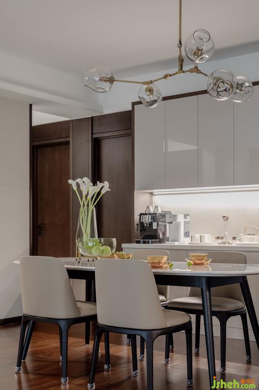根据功能需要设计师将橱柜设立为上下两层,上柜的高度使得顶端与天花板之间产生“留白”的效果,减少其压迫感。