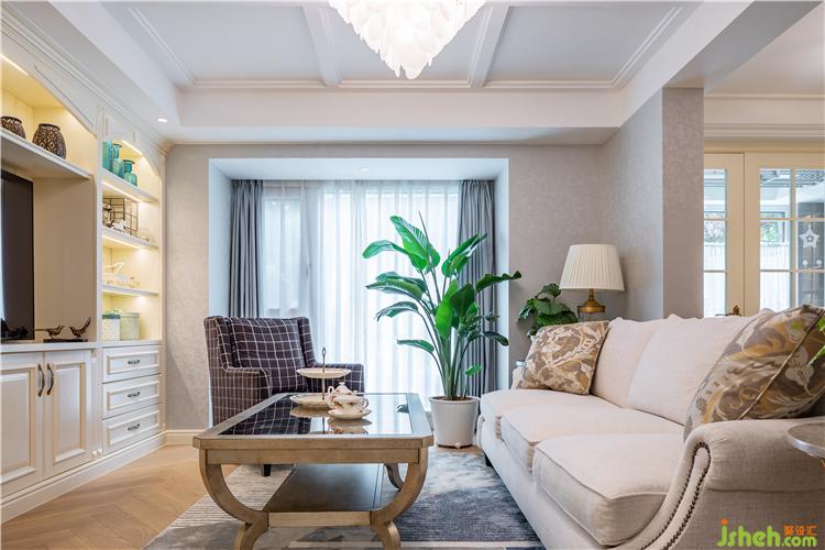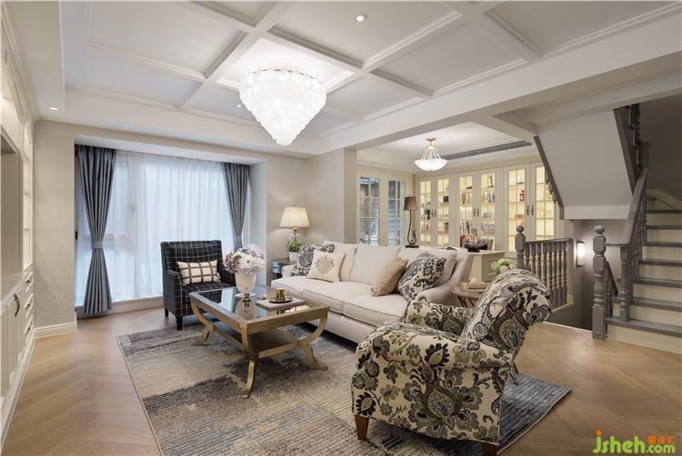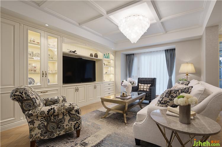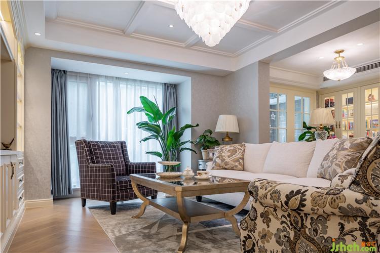 客厅采用嵌入式石膏吊顶,搭配精致的吊灯,复古造型的组合沙发,让现代美式风格得以进一步的彰显。