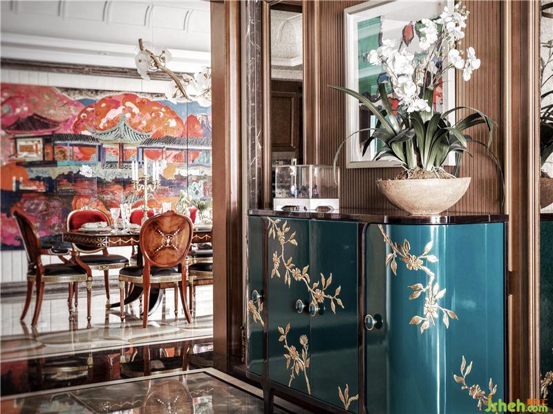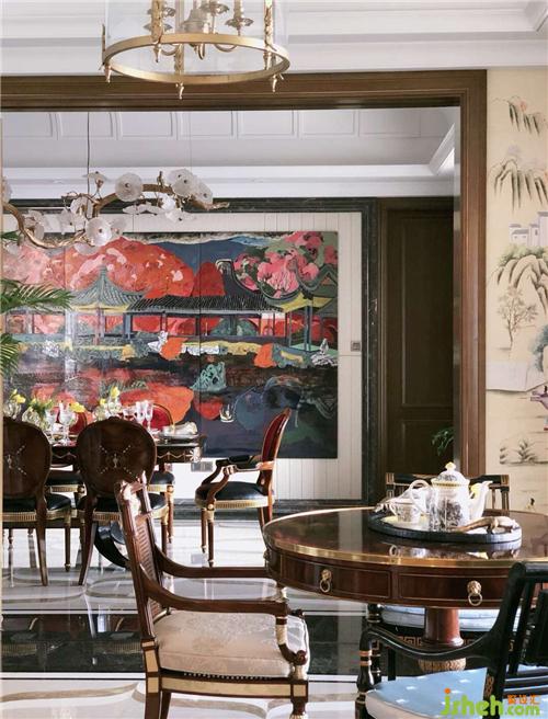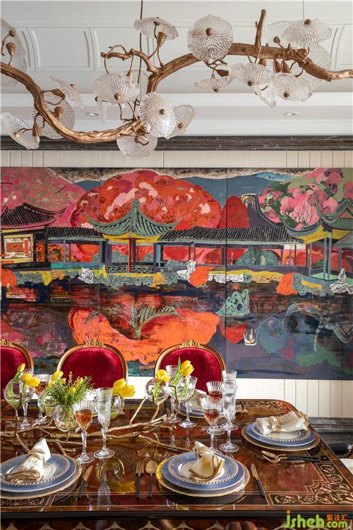 同样在餐厅的设计中,豪宅装修设计也选择了一幅漆画,但是另行其道,使用了一些当代油画的画法,用整体的色彩感和意境美的表达呈现出当代元素,浓烈的色彩感与餐厅的会客氛围和食欲遥相呼应。精致的灯具在餐厅中的布置也是点睛之笔。