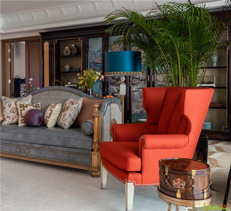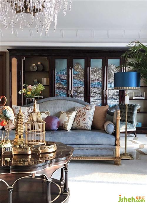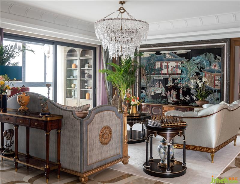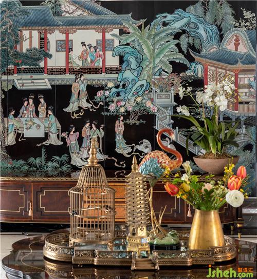 对于客厅的稳重大气,文化的元素要得以呈现,于是针对墙壁的挂画室内设计师特意找艺术家定制了一幅中式传统漆画,在漆画的内容上使用了中国传统的工笔画法表现,力求场景的丰富度、中西方文化的交融的感觉。