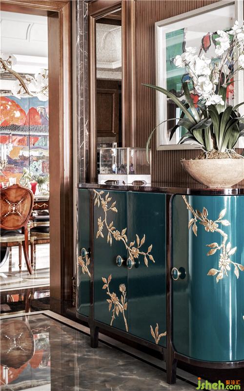 餐厅与客厅间有一个过厅,豪宅装修设计特意设计成了一个茶室,茶室的对面正好对着江景,女主人可以在这里和闺蜜们喝一杯下午茶,相当于是一个小型会客厅。女主人喜欢收藏杯碟,在过厅靠墙的位置上放置着一张精致的酒柜,正好可以收纳这么多年来女主人的收藏,为下午茶增添一份仪式感。