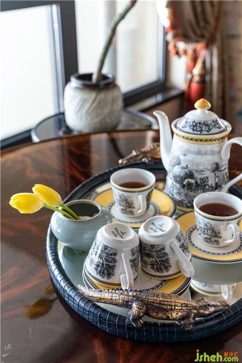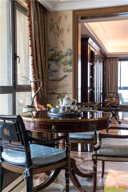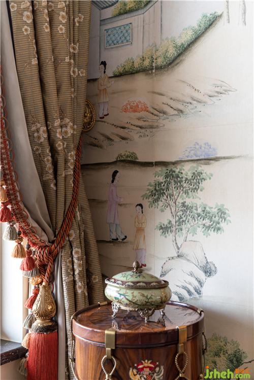 在茶室墙纸的材质和表现形式上,没有选择常规的墙纸,客服重重困难力求多元化,材质是宣纸,图案都是纯手绘,描述的是清末广州十三行外销墙纸上的清末中国人生活图,呈现出中西文化相互交融的一段历史氛围。