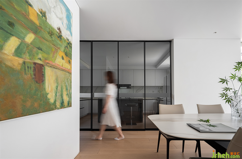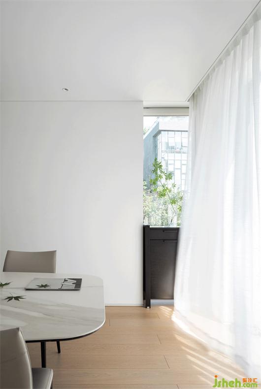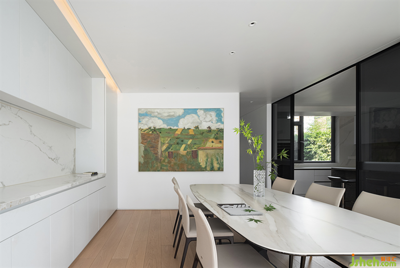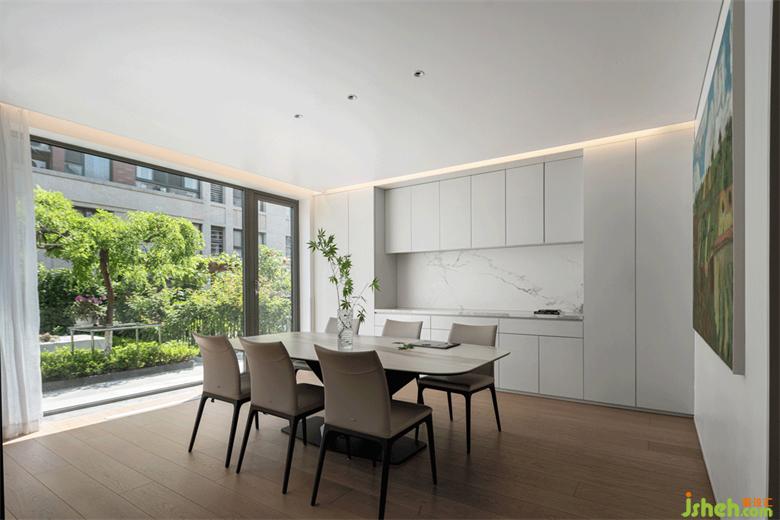 为了将空间视觉尺度应用到最大化,餐厅利用大面积落地窗引入庭院的包罗万象,也平衡了屋内的极致纯粹,让一切和谐共融,为静态的空间赋予动态的视觉感与自由感,让居住者在细腻的浸润中,倾听来自内心深处的动容。