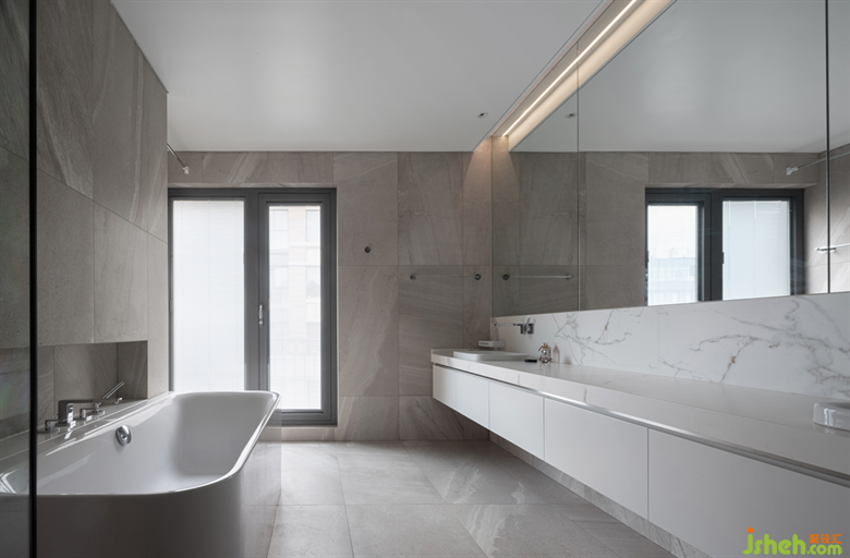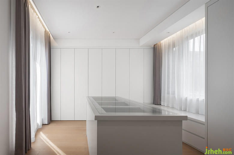 干练、明亮、留白,方寸之间尽情展现着女主人对衣帽区域的考究姿态。盥洗区域隐形储藏柜,嵌入墙面,使墙与柜完美融为一体,既提供展示与收纳,又将空间统一起来,克制而整洁。