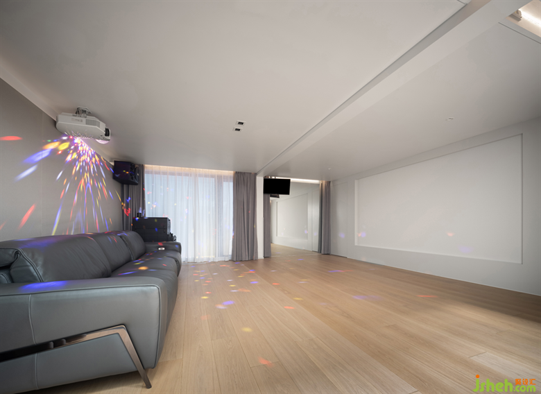 影音和健身区域设计的核心在于通过线条和白色形成大面积视觉延伸,让视界突破尺寸的界线,构成更开敞的空间布局。