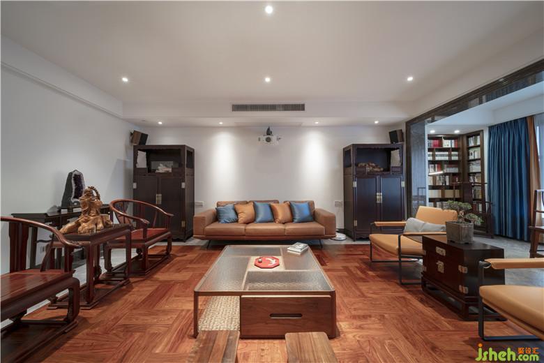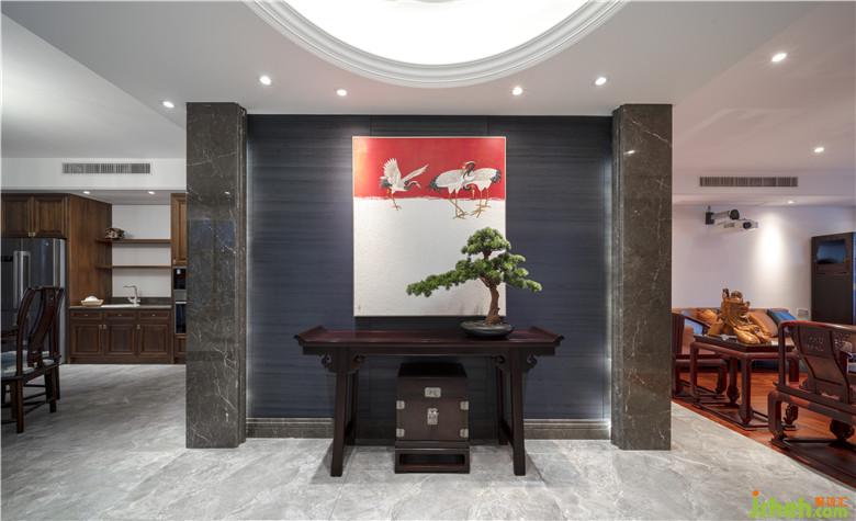 起初业主给我们的构想是,他们很喜欢明式的家具,希望自己家里能够呈现出来书香世家的那种感觉,手里还特意撰了那本王世襄《明式家具研究》要求我们去专研一番。但是呢,他们又不想沦落为别人眼中的“老干部”之家,希望整个空间里融入年轻的色彩,跳跃的感觉,但是呢,也不要别人认为的“新中式”的感觉,所以我们在设计的时候几乎摒弃了原有的设计思维,结合大量的现代风格中生活中常见的皮革的沙发,灰色的仿石材的地砖,拼法也是现代的,深灰色的大理石做的背景,做的门套,就连门套的顶上断层也是跟业主沟通过了好几次才最终确认下来的,墙面呢就干脆来了个四白落地,业主说他的明式家具很出彩,找了好多的厂子,尺寸严格按照了原本当时的设计,一丝一毫都不能动,客厅那对万历柜的细节他们也非常的满意,所以,白墙它们来说,绝对是最好的解释了。然后我们一致的通过,吊顶都不要做太多没必要的造型修饰了。