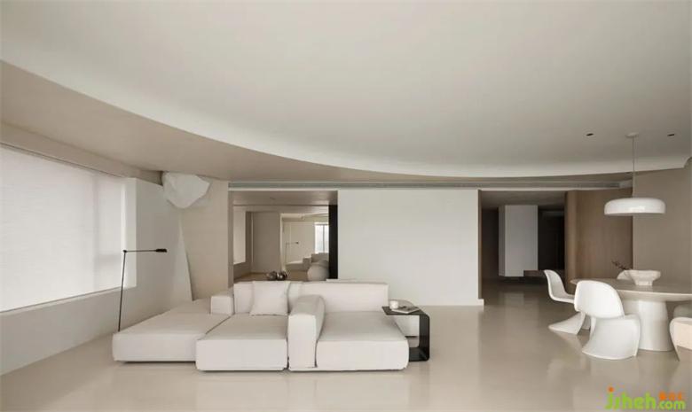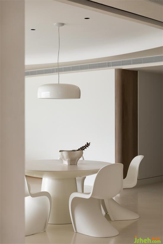 空间的“多与少”,江景大宅设计微妙且直白。客餐厅开放式格局,行云流水的几何线条被折叠、翻转于空间中,模糊了区域边界和认知,构建出更多元的体验场景。没有隔栈堆叠,江景大宅设计以沙发餐桌为重心的生活形态渐次向外自由延伸,光影流转间,满是生活哲意。