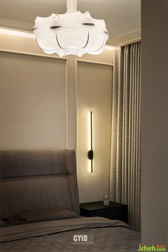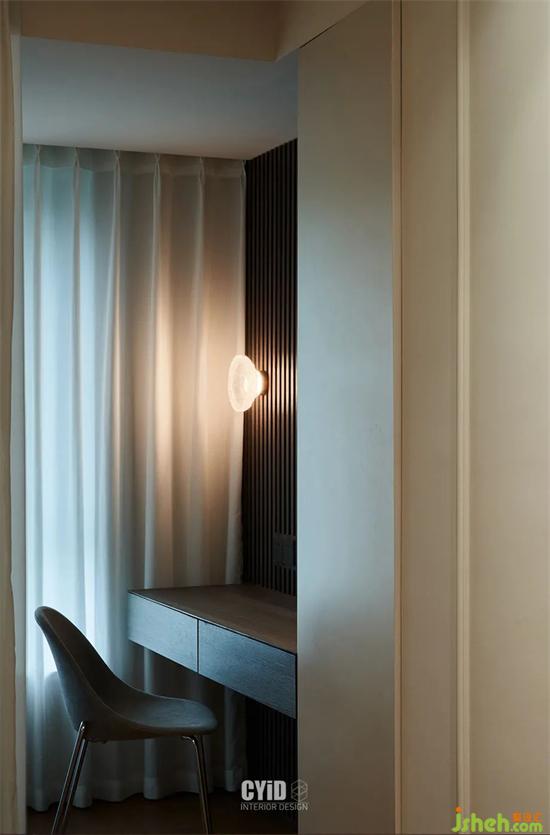 阳台划分出一块书房功能的小空间,家装设计满足偶尔的工作需求和独立思考的区域。色系统一赋予卧室这个休憩空间更多的温润和舒适感,一盏颇具氛围感的壁灯,柔和的灯光也打破整个空间的沉静。