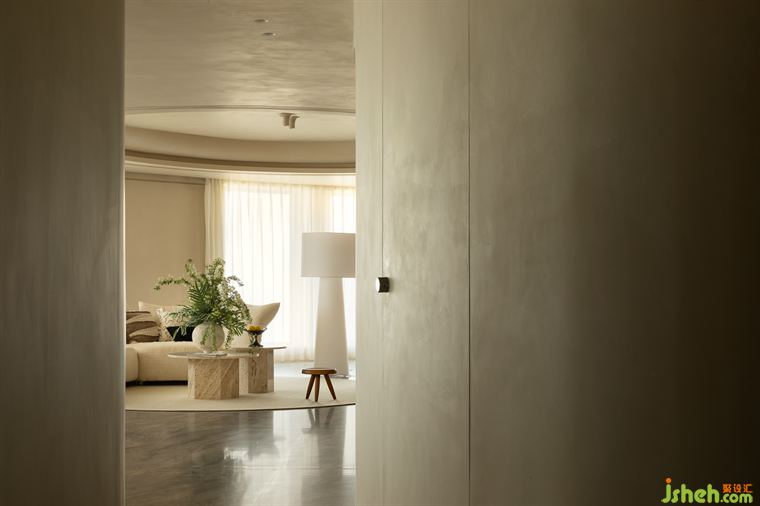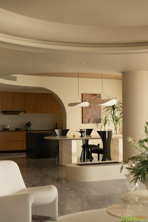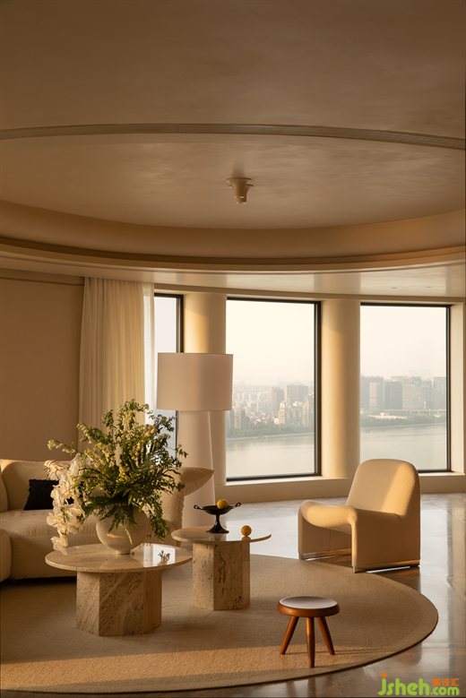 大宅设计将生活状态镌刻在时间的褶皱里,让场景叙述故事,还原理想与温度,细碎与丰盈。在光的聚合散落中悦归栖居,浪漫婉转间,趣知与仪式萦绕不息。偌大的窗面消解室内外的边界,自然顺势倾入生活。地面石材纹理呼应江面的连绵,渗透进自然风物,在光与影间映现日常生活场景,“人”的活动继而完成了情感的传递与流动。