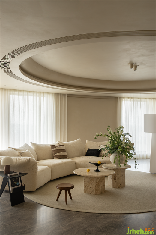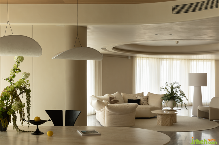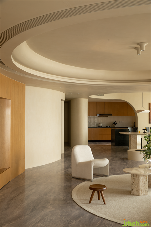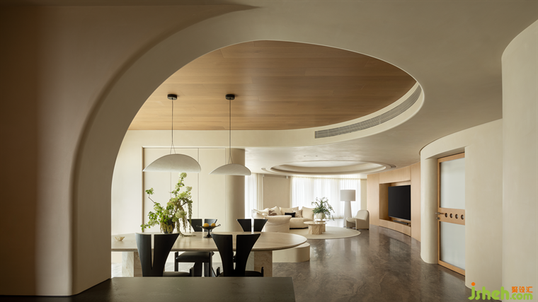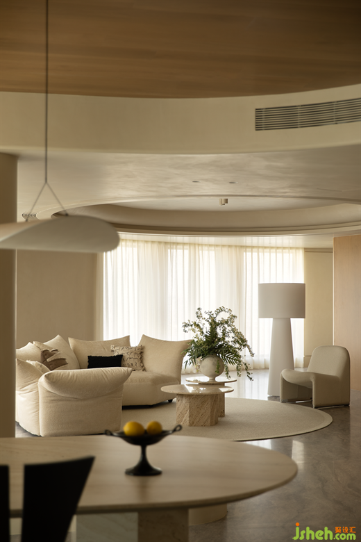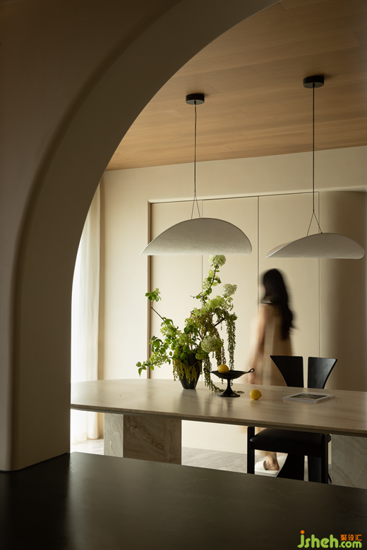 自然之意自山野向室内流动,与日共生,与景同存。落日自陷黄昏,也道烟火灼灼。环形窗景为室内带来通透的生活体验之余,亦引入光影及季节变化的自然节律,让时间的流逝具像化为设计元素。