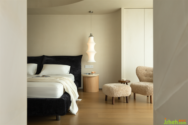 (主卧)将生活方式塑造成独有的形态,线条和几何结构简而清晰,弧线让氛围圆融聚合,呈现出舒适的包裹感,婉约自然,不尽回响。而留白的语境里,想象在空间中肆意生长。在日复一日里,承载着平淡却绵延的情感。
