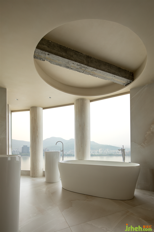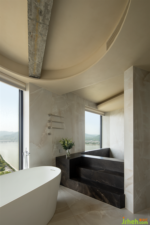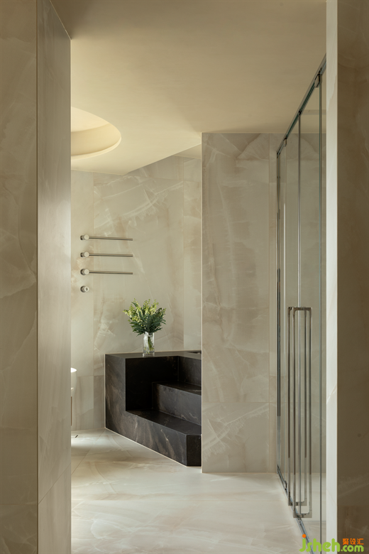 (主卫)绵延一片的素净,肌理融合在空间氛围之中,流畅的动线和宽阔的视野赋予空间通透明朗,大宅设计大面积投入的自然光线让整个空间有了呼吸,一个放松且无限创意的环境由此形成。