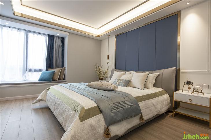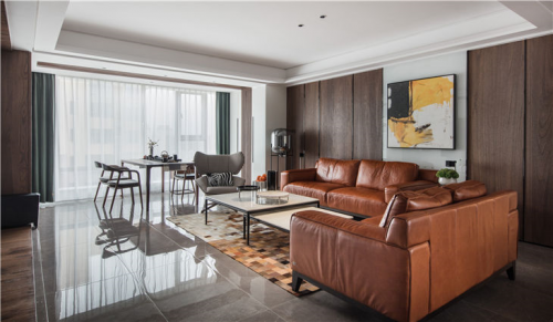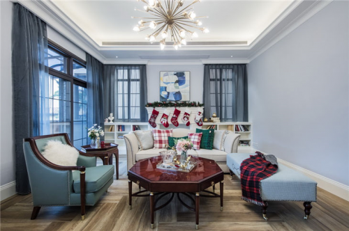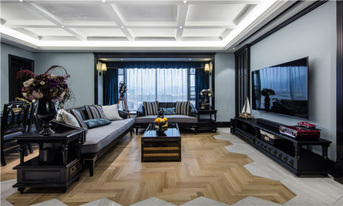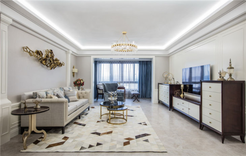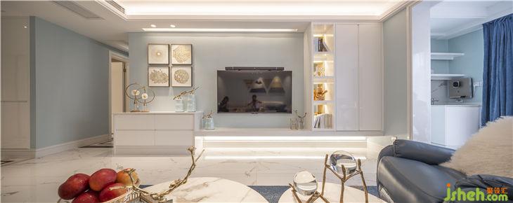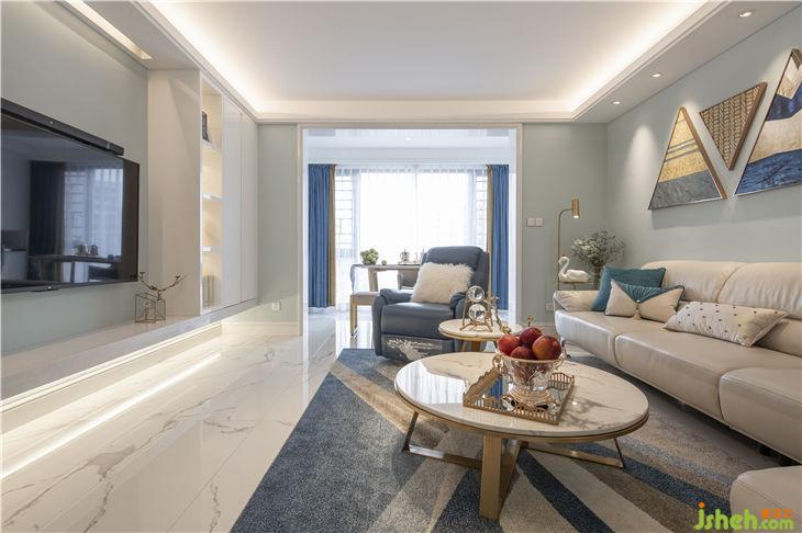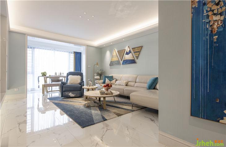 客厅公共区域地面选择了鱼肚白瓷砖经加工切割成不同宽度的瓷片进行拼接,墙面采用蓝白两种色系,使视觉上更具通透感。