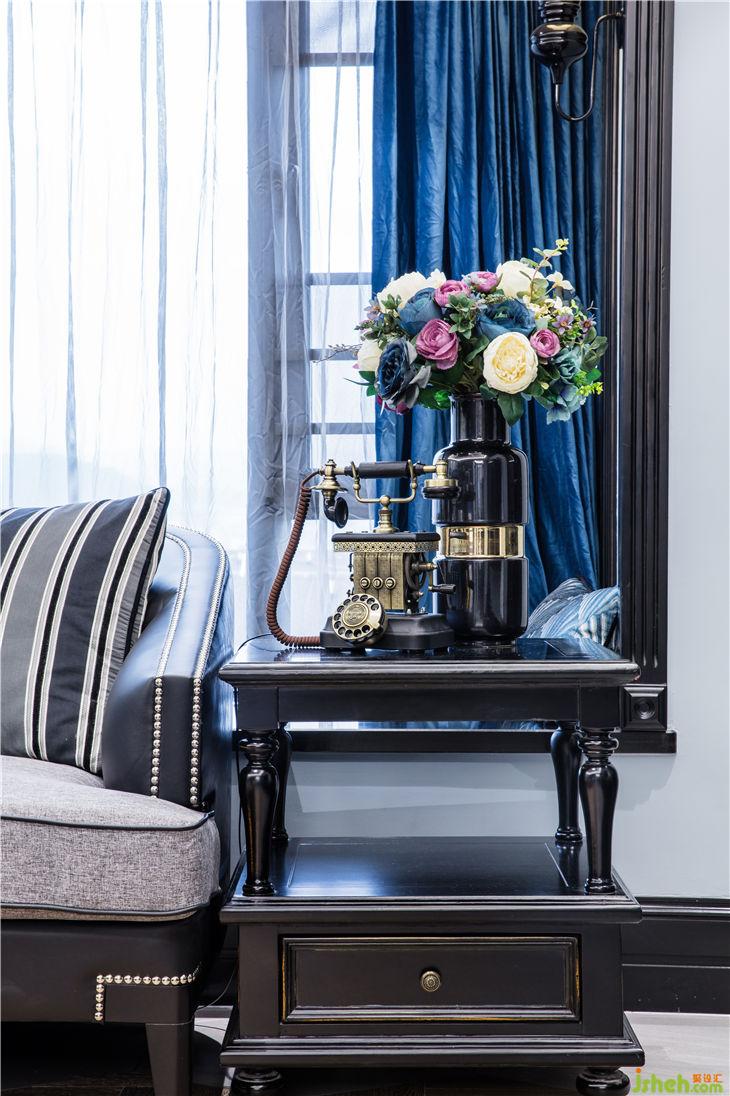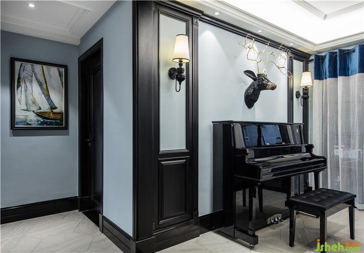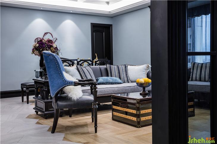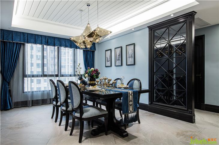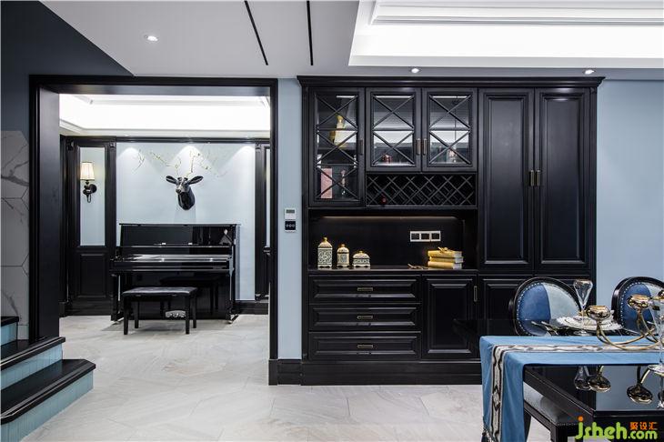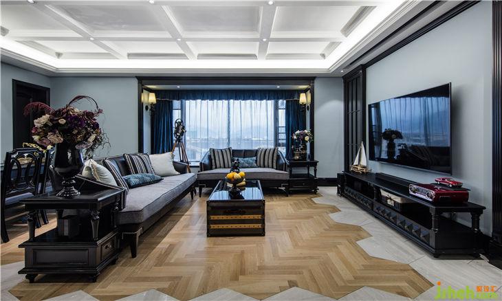 一间有窗的房子就像一间有风景的家,而这个户型客厅位置有着巨大的飘窗,外面的风景被投射进来,投射在室内的每一面墙上。先有距离,然后有了光,从窗户影射进来的阳光打在人字拼的木地板上,让这个暗黑风格的室内环境充满一丝丝温润。莱茵蓝的墙面漆与黑色的木饰面,人字拼的木地板与平行的六角砖相结合不仅打破固有的氛围,光线通过折射迅速充盈整个空间形成鲜明的对比。