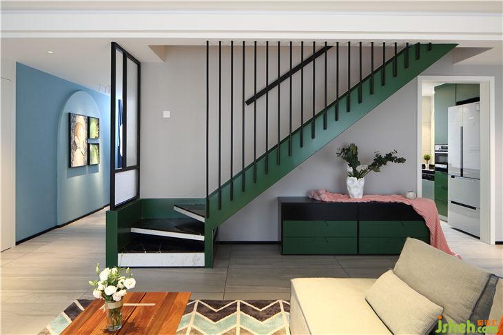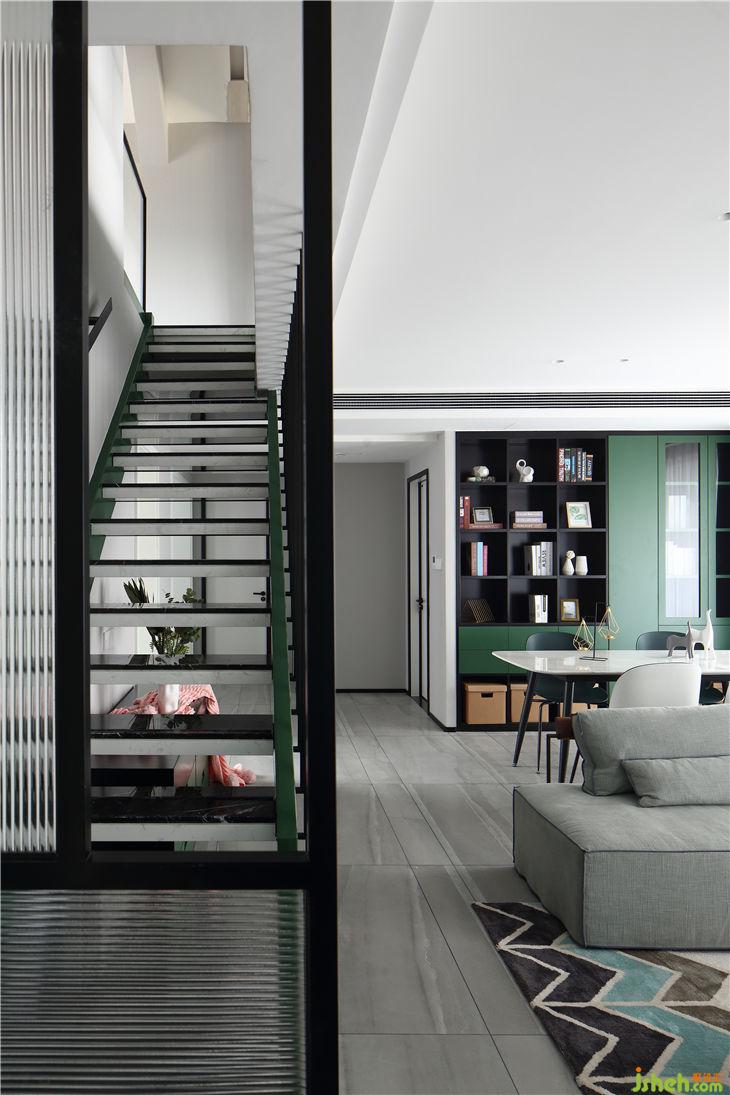 墨绿色钢结构的楼梯采用镂空设计,外挂的栏杆让原结构只有700mm的楼梯不显得拥挤。