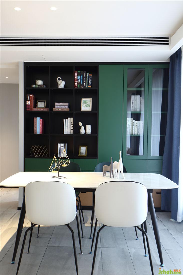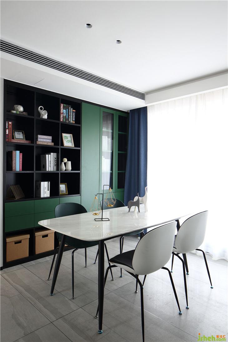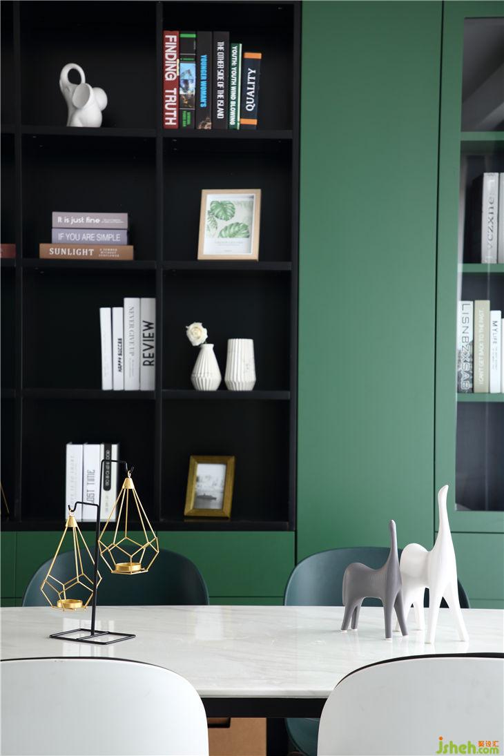 业主作为85后的年轻父母,依然童心未眠,喜欢色彩艳丽的北欧。最终选取了墨绿色作为主体色调。设计师采用灰色和黑色进行了调和,让绿色在居住空间中更显得温润地得以呈现。