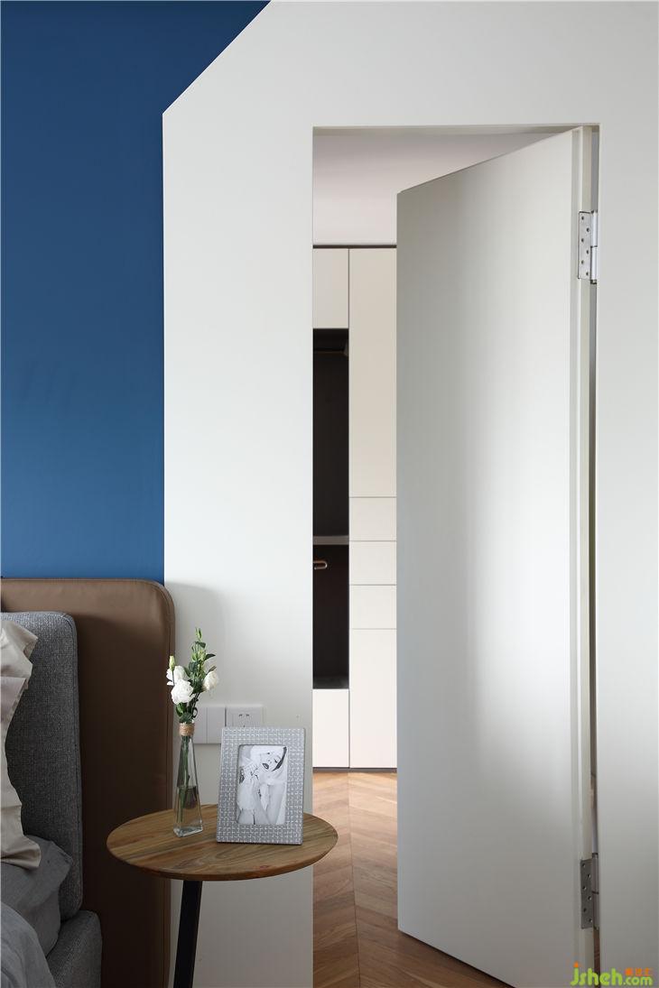 二楼主卧原始结构最低点仅仅只有2.2米,而最高点达到了4.25米。如此高的落差既要解决空调的出风又要为环境增加照明需求。我们设计出弧形吊顶内嵌灯带,使得空间感、层次感更强。飞碟灯的光照角度补充了传统射灯的劣势,弧形屋面灯光照明问题得到很好地解决。利用斜型屋面顶部残余空间安装了中央空调,最大程度利用有限的空间。局部软装的对比色跳了出来让空间更温馨。